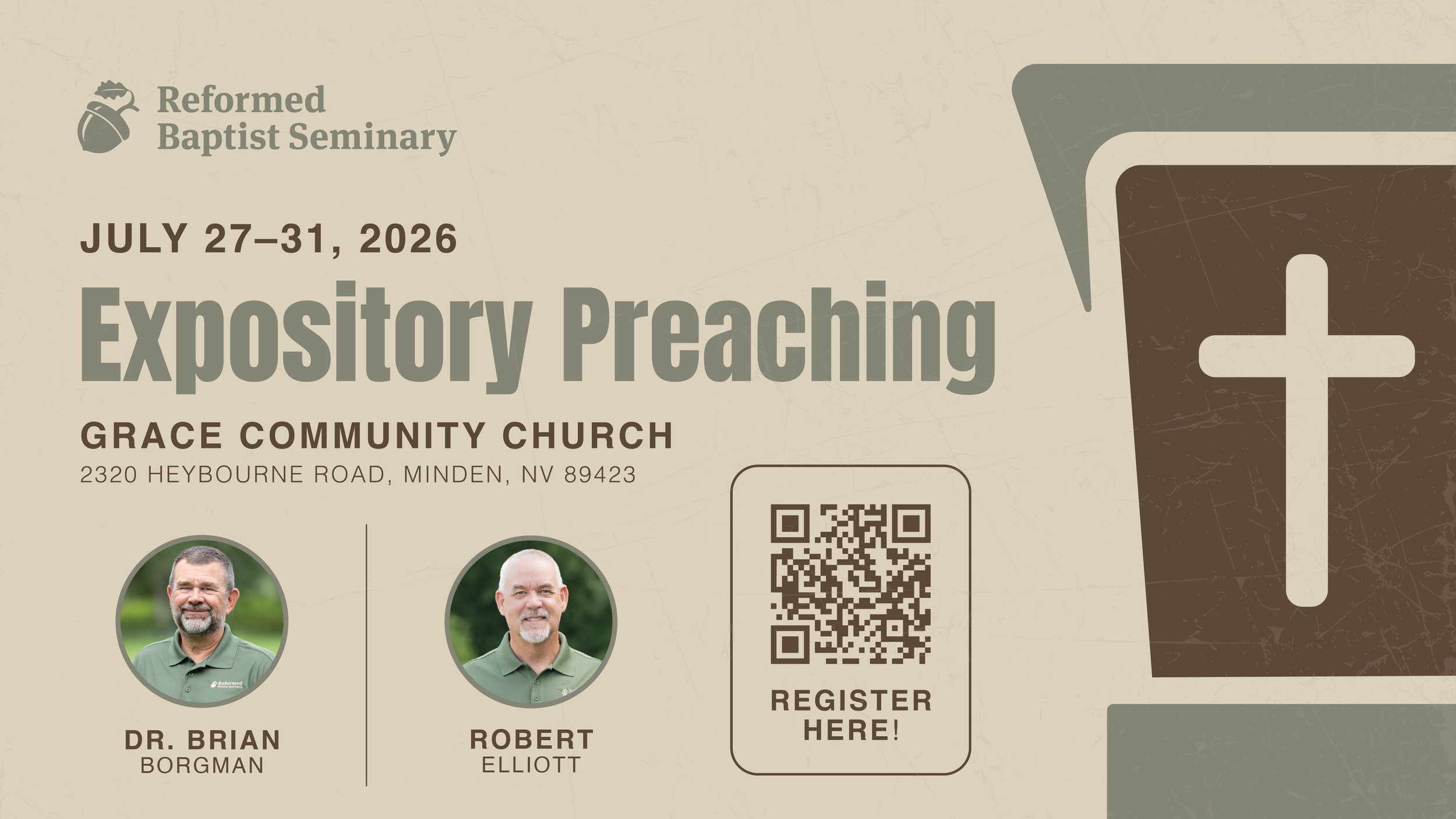 Join us July 27–31, 2026 at Grace Community Church in Minden, Nevada, for a rich five-day theological module on “Expository Preaching.” Guided by esteemed pastor-scholars Brian Borgman and Robert Elliott, this immersive study will lead you deep into the craft of sermon preparation and delivery. Together we will explore the heart of expositional preaching, gain clarity on topical and redemptive-historical approaches, and see why dependence on the Holy Spirit and a life of earnest prayer stand at the center of every faithful pulpit ministry.